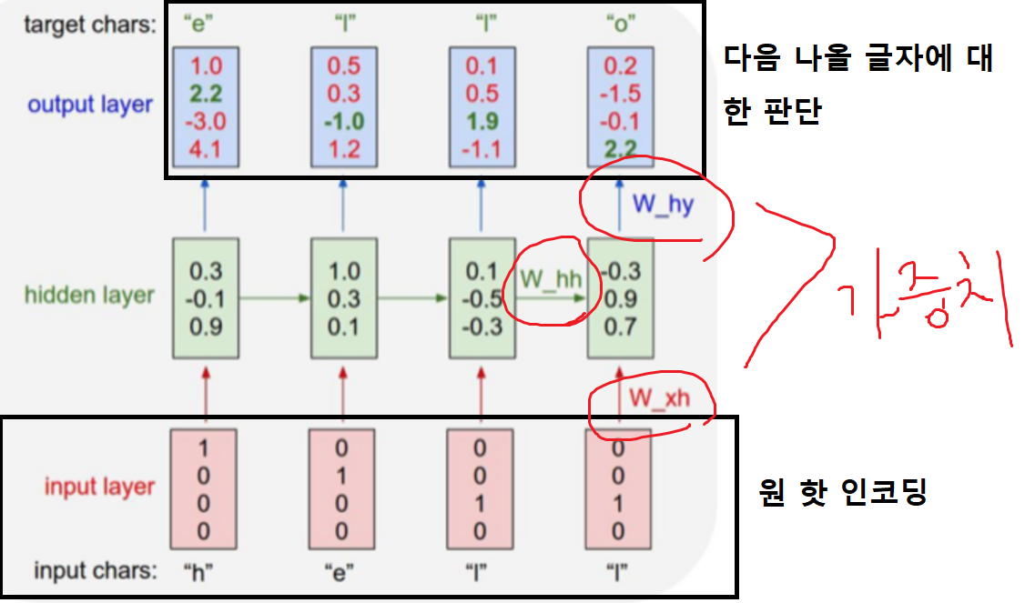 최종적으로 위와 같이 RNN이 만들어 진다. 원핫인코딩으로 h/e/l 을 인코딩하고 그 값들의 가중치와의 선형합과 전 은닉층의 값과 가중치의 선형합을 더해 현 은닉층 값을 정하고 출력층으로 보내면 출력층에서 다시 가중치와의 선형합을 통해 다음에 나올 글자를 판단한다. 가장 높은 원 핫 인코딩 값에 의해 다음에 올 글자를 판단하는 것이다.