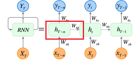 이를 수식으로 살펴보면, 새 은닉층의 값(h_t)은 전 은닉층의 값(h_t)과 현재 입력값(x_t)에 가중치(w_hh)의 선형합(f_w)과 같다. 여기서 중요한 사실은 현 은닉층값을 도출할 때, 현재 입력값 뿐만 아니라 전의 은닉층 값을 참조한다는 점이다. 이 과정에서 과거의 기억이 신경망 내에 온전히 전해지게 된다.