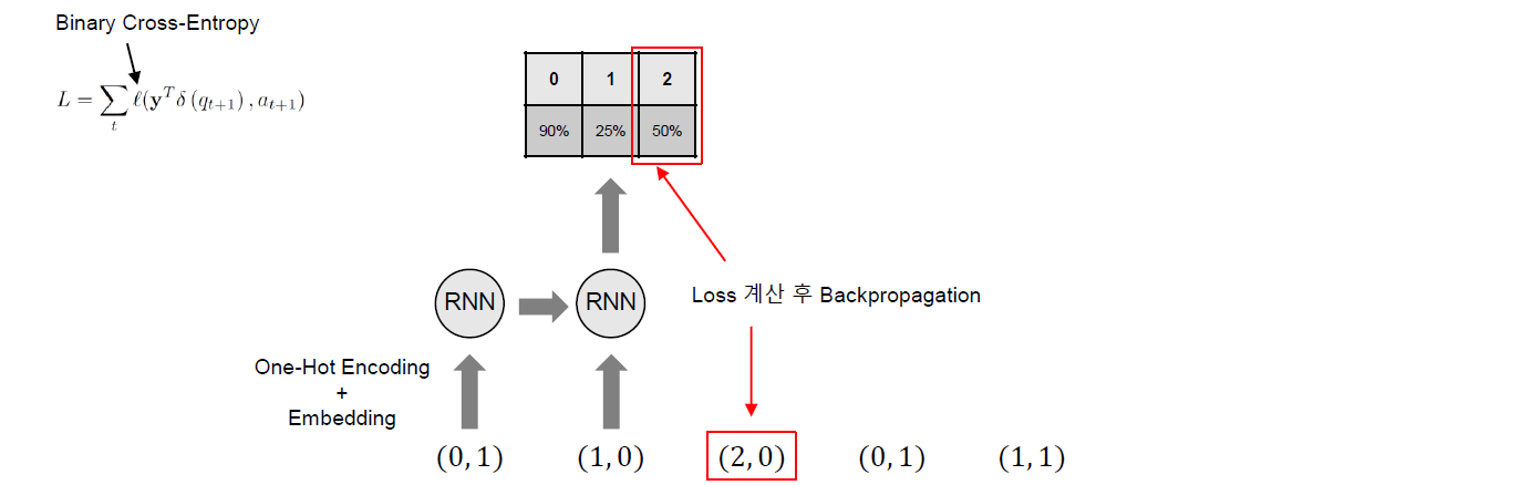 각 단계별로 순차적으로 학습을 진행하는데, 이때 핵심은 전 단계에서 추론한 다음 문항에 대한 정답률과 다음 문항에 실제 정답과의 오차가 최소가 되도록 Backpropagation(오차 역전파)하는 것이다. 손실함수로 binary cross-entropy 를 사용하는데, 수식의 내용을 살펴보면 도움이 된다.