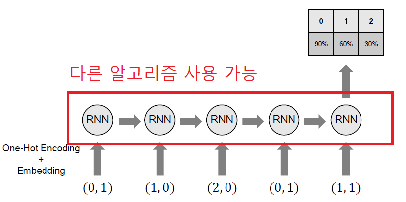 데이터 임베딩이 완료되면 해당 데이터를 바탕으로 심층 지식추적 추론을 실시한다. 위 문제의 경우 5문제를 푼 데이터 셋을 통해 다음 6번째 문제에 대한 정답 확률을 구하는 상황이다. 위 논문의 예시에서는 RNN 알고리즘을 사용하였는데 다른 알고리즘(LSTM / GRU 등)을 사용할 수 있다.