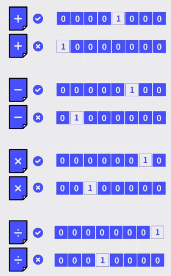 문제의 종류는 4가지 (더하기 / 빼기 / 곱하기 / 나누기) 가 있고, 문제의 정답여부는 2가지 (맞음 / 틀림) 인 자료를 원핫인코딩으로 표현한다고 가정해보자. 이 데이터는 총 8가지(4*2) 벡터에 원핫인코딩 할 수 있다. 아래의 예시와 같다.