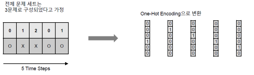 위의 사례도 마찮가지의 원 핫 인코딩이다. 문제 데이터 셋은 총 3문제(0,1,2로 표현), 정답 여부는 2가지(맞음, 틀림) 일 때 각 상태를 오른쪽과 같이 표현할 수 있다. 3*2=6가지의 벡터항으로 원핫인코딩 할 수 있다.