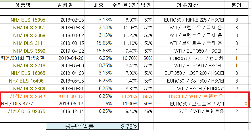 다음은 현재 보유중인 ELS/DLS 상품입니다. 빨간색 박스 안의 상품은 이번에 매수한, 혹은 매수할 예정인 상품입니다. 역시 마찮가지로 DLS 상품입니다. 저는 지금이 DLS 상품을 매수하기 적합한 시기로 보고있는데요, 그 이유는 크게 3가지 입니다.
