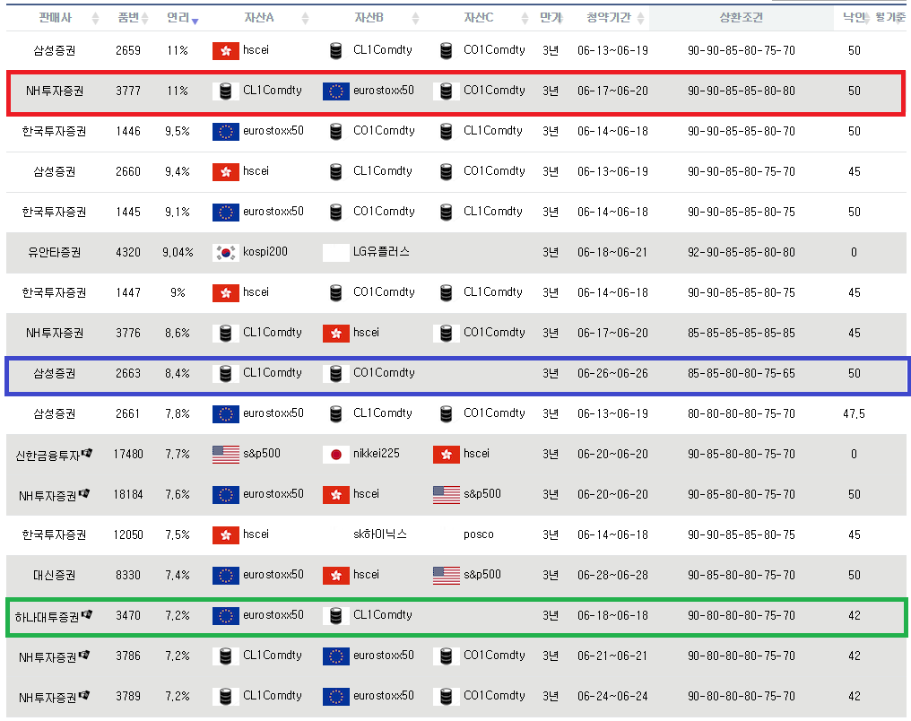 안정성 정도에 따라 기본적으로 3가지 상품을 추천하고 싶습니다.(리스크 정도는 색깔순서대로 빨>파>녹) 일단 홍콩H 지수가 들어있는 상품은 배제했고, 남아있는 상품 중에 기초 자산의 수가 적은 상품, 낙인이 낮은 상품들을 골랐습니다. 하지만 저는 아무리 봐도 맨 위의 NH 투자증권 3777 상품이 좋다고 생각되네요.(워낙 고수익률을 좋아해서....^^)