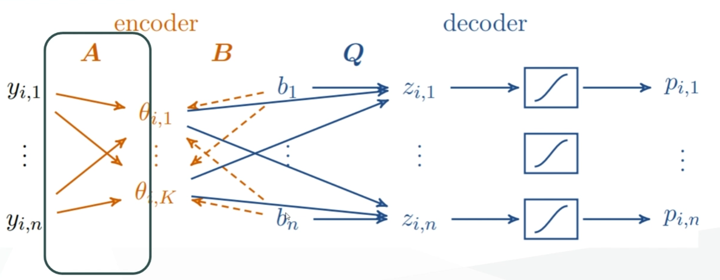 -행렬A를 매핑하고 기능-문항 맵핑된 행렬Q를 가진 다차원 문항 반응 이론 모델을 통해 예측된 반응으로 다시 디코딩함