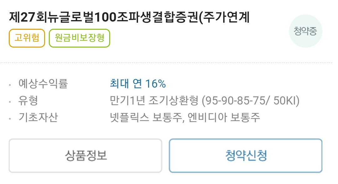 뉴글로벌 100조 ELS 는 미국의 시총 100조 이상의 대기업을 기초자산으로 하여 높은 수익률과 높은 리스크를 동반하는 상품입니다. 함부로 추천하거나 투자할 수는 없지만 꽤나 매력적인 조건들을 갖추고 있어 적극 이용해볼 생각입니다.