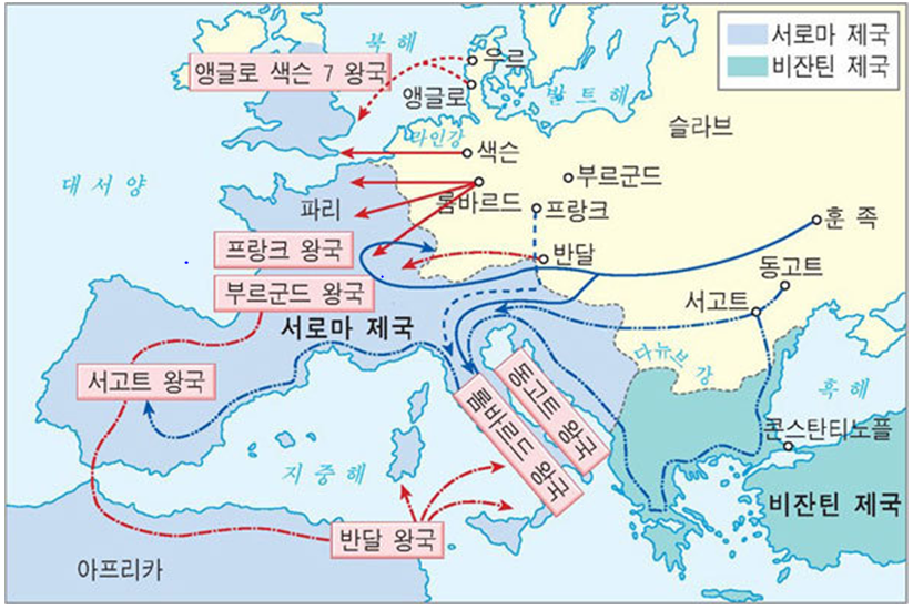 민족대이동: 4세기 말 본거지를 떠난 훈족에 쫓긴 게르만족이 로마 제국을 침입하면서 생긴 큰 변화. 민족대이동은 고대에서 중세로의 전환을 가져왔음. 민족대이동의 원인으로는 기후변화로 인해 훈족이 살던 중앙아시아 목초지가 말라버린 것과, 한무제의 훈족정벌정책을 꼽을 수 있음. 4세기에서 6세기까지 200여년 동안 이뤄진 대이동으로 훈족이 동유럽쪽으로 몰려오자 훈족에 쫓긴 게르만족이 로마제국을 침입하면서 서로마제국의 멸망을 야기함(476년)